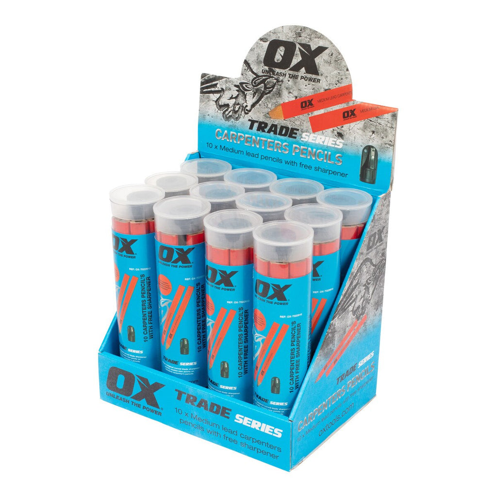The OX Trade Carpenters Pencils with FREE sharpener. Comfortable grip and easy to use. Available in pack of 10, complete with sharpener. (Hard lead – green)