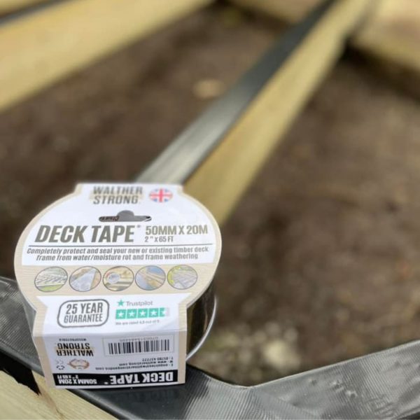 Deck Tape® is a non-butyl self-sealing tape manufactured from a massively strong polymer acrylic adhesive, which gives a completely waterproof and weatherproof seal.With a permanent adhesive bond for 50 years and a 25-year guarantee, this greatly adds to the life of your deck frame. Tested with all timber treatments.